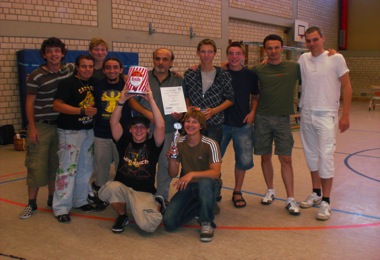 mit jeweils sechs Spielern auf einem durch ein Netz geteilten