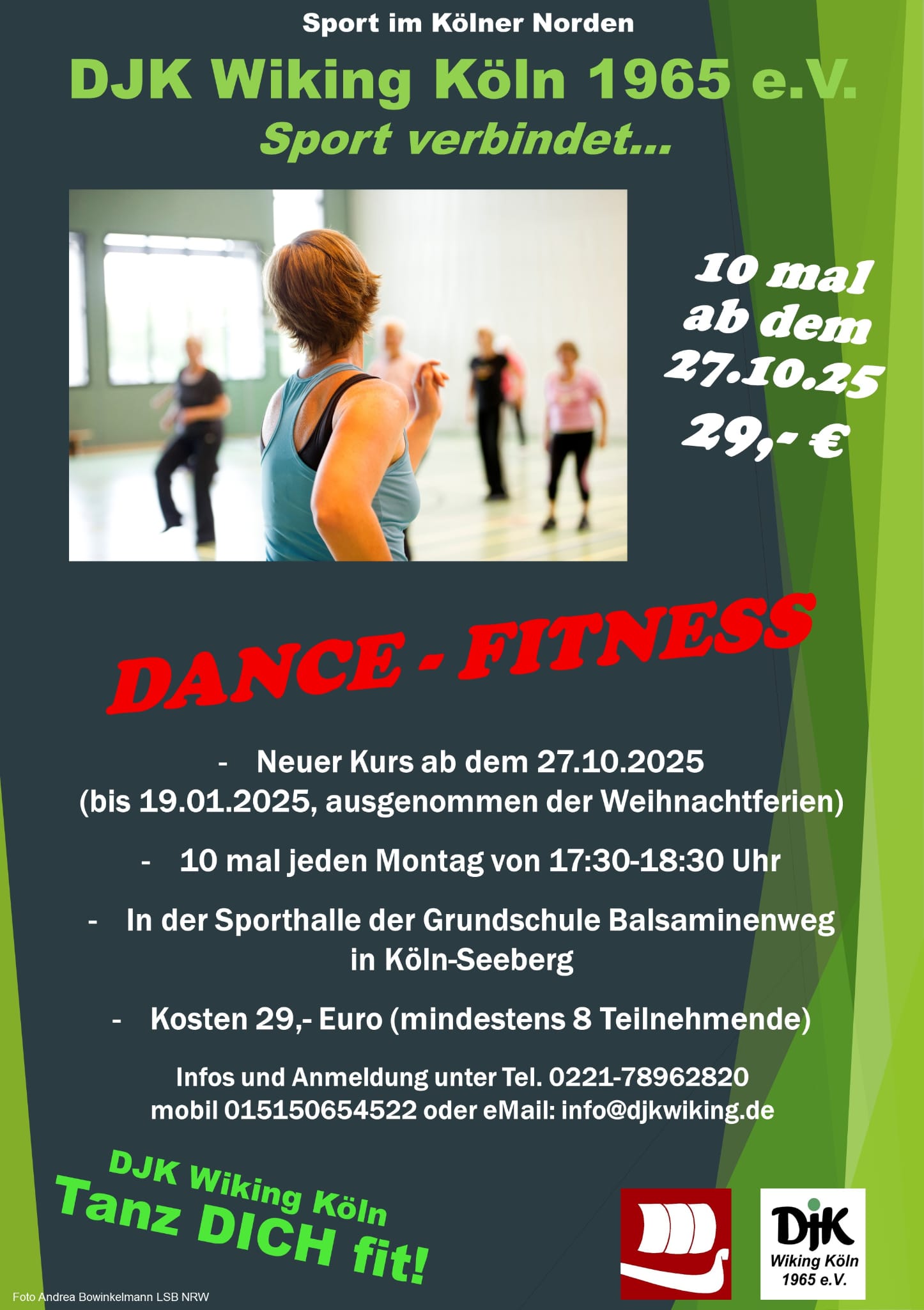 Der Name ist Programm: Die Anleitung zum Tanzen führt zugleich zu einer höheren Fitness. Für den besonderen Kurs ist auch für Vereinsmitglieder eine zusätzliche Gebühr in Höhe von 29 Euro zu entrichten. Der Kurs findet jeweils montags von 17:30 Uhr bis 18:30 Uhr statt und dauert (bei einer Pause über die Weihnachtsferien) bis zum 19. Januar 2026. Sei dabei und tanz dich fit! Alle weiteren Infos auf dem unten stehenden Plakat.