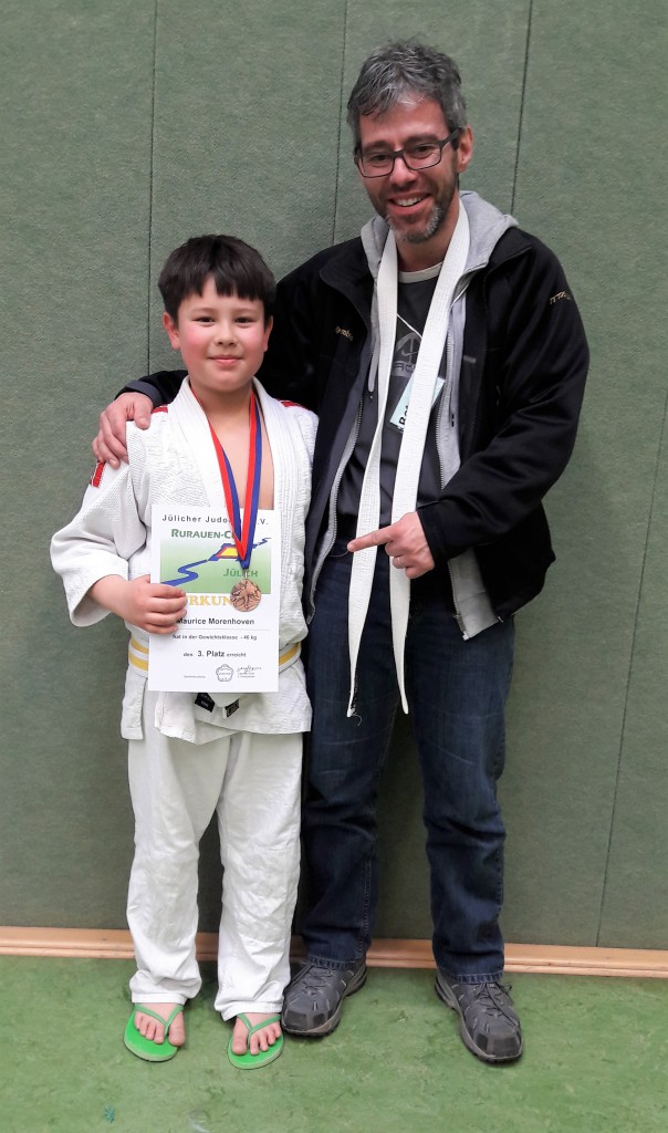Den erfolgreichsten Tag erwischte Maurice Morenhoven in der Klasse bis 46 Kilogramm. Seine Gruppe bestand aus fünf Kämpfer und somit galt, „jeder gegen jeden“. Es war auch sein erstes Turnier. Und beim Wettkampf geht es anders zu als beim Training. Das musste auch Maurice feststellen und verlor trotz aller Mühe seine ersten drei Kämpfe. Einige hätten da schon das Handtuch geworfen. Mit viel gutem Zureden von Betreuer Stefan Lemmer ging Maurice aber dennoch wieder auf die Matte, gewann den vierten und letzten Kampf mit der höchsten Wertung (Ippon) und konnte sich dadurch die Bronzemedaille umhängen. Es zeigt sich wieder, aufgeben ist keine Wahl. Maurice hat Mut und Selbstbeherrschung bewiesen und wurde belohnt.