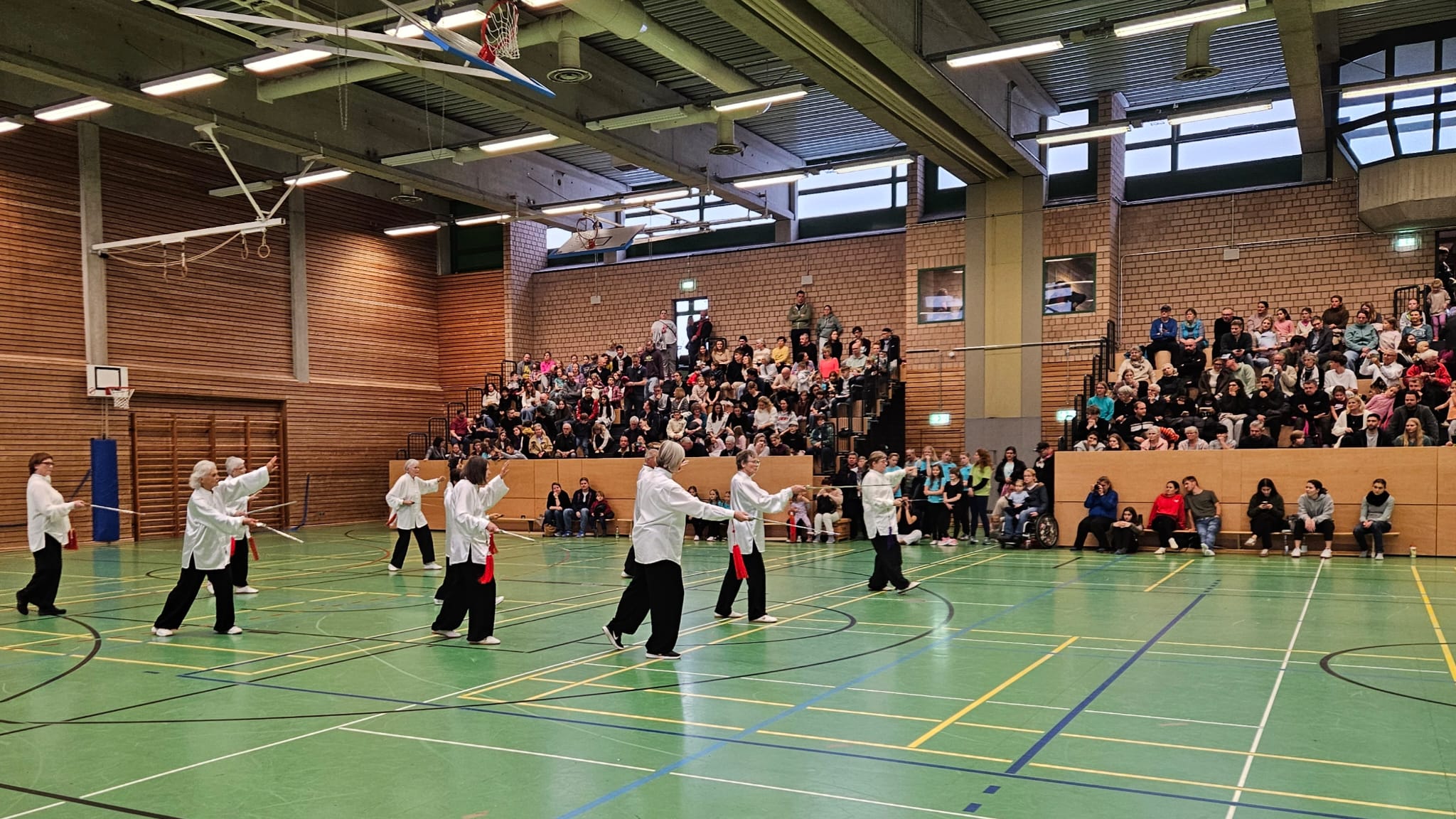 Den Auftakt machte eine QiGong-Gruppe, gefolgt von der Vorführung der Volleyball-Abteilung (Foto oben). Ein weiteres Highlight war die Aufführung der Tanzgruppen (Foto ganz oben). Anschließend wurde es noch einmal traditionell mit der TaiChi-Gruppe (Foto unten), ehe ein typischer Kinderturn-Parcours die zahlreichen anwesenden Kleinkinder bis zur Pause zum Mitmachen aufforderte.