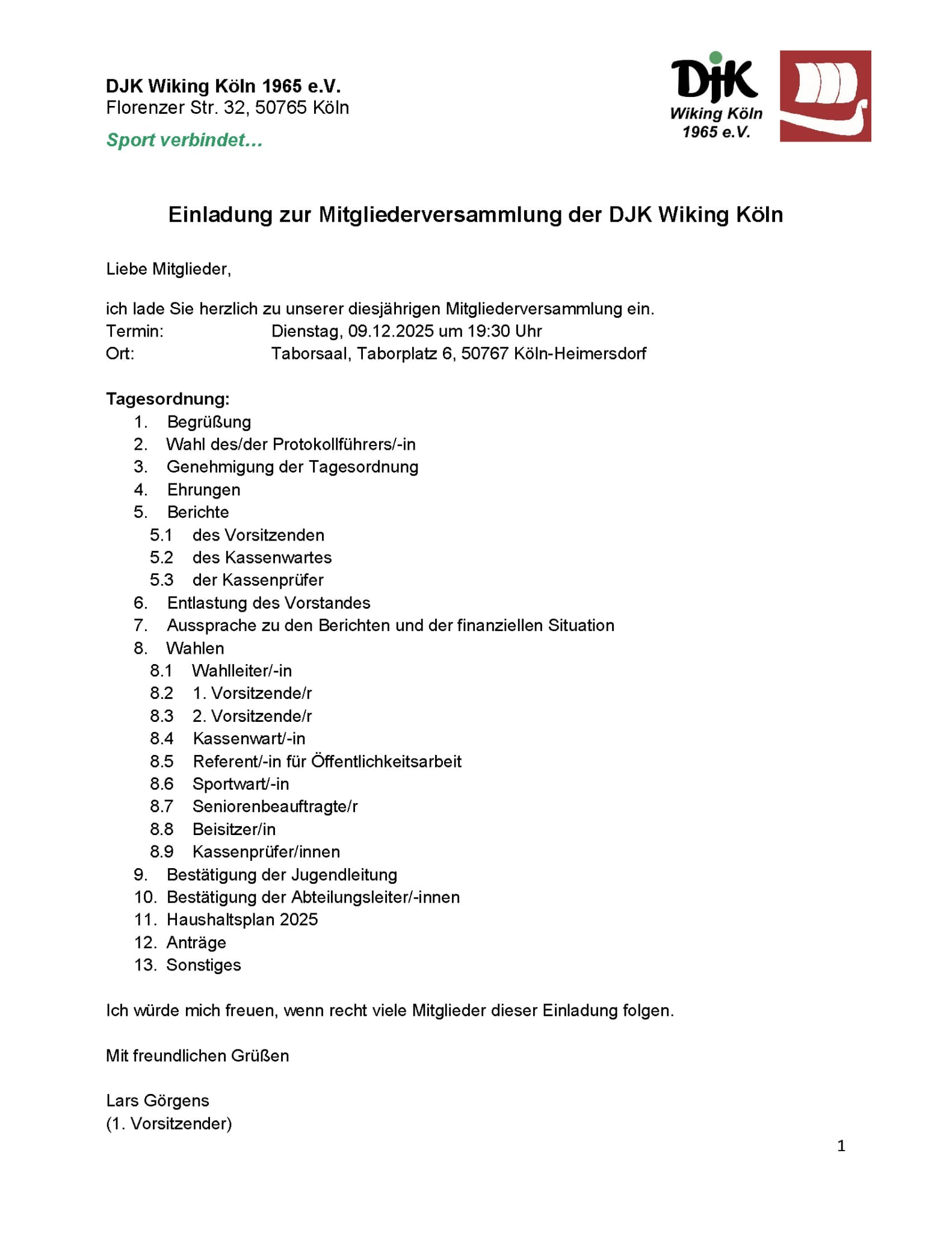 Am Dienstag 9. Dezember findet ab 19:30 Uhr die Mitgliedversammlung der DJK Wiking im Taborsaal in Köln-Heimersdorf statt (Taborplatz 6, 50767 Köln).