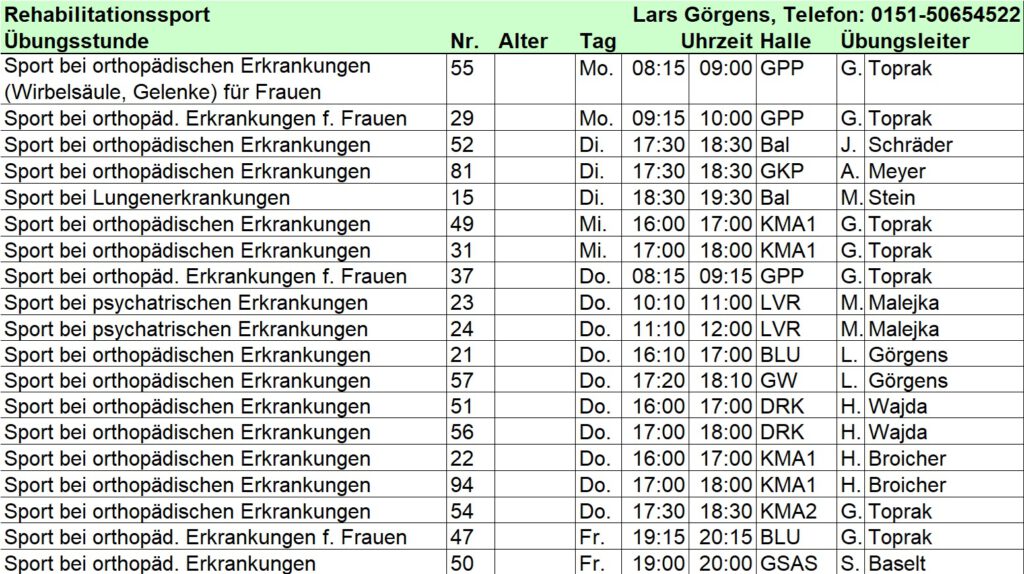 Informationen zum Inhalt der Trainingsstunden entnehmen Sie bitte den Darstellungen der einzelnen Abteilungen. Den Trainingsort der jeweiligen Halle entnehmen Sie bitte dem Hallenverzeichnis. Nachfolgend die Übersicht über die Angebote der Abteilungen:1 – Basketball