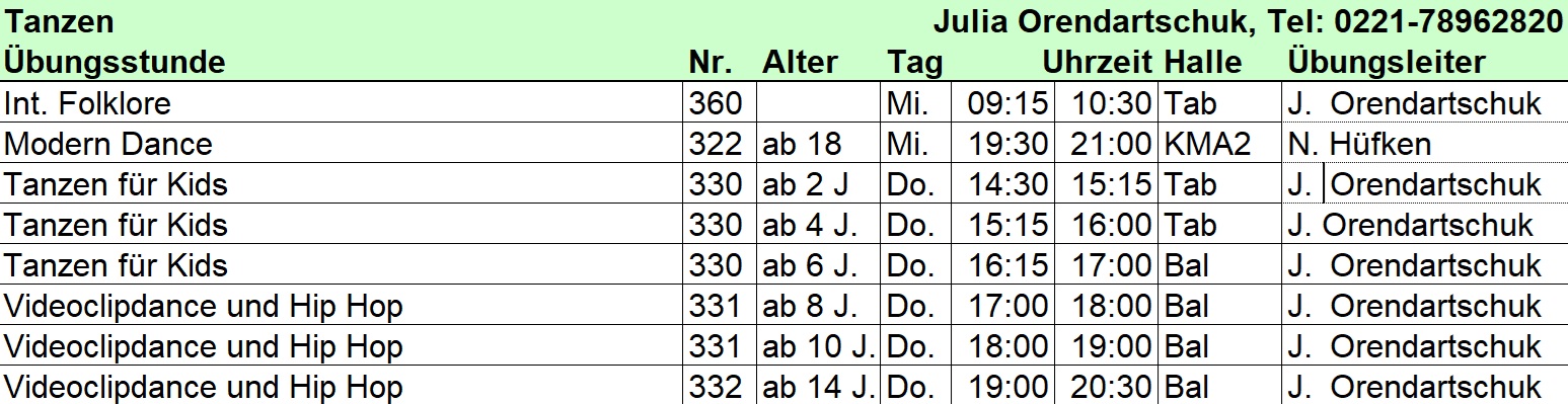 Informationen zum Inhalt der Trainingsstunden entnehmen Sie bitte den Darstellungen der einzelnen Abteilungen. Den Trainingsort der jeweiligen Halle entnehmen Sie bitte dem Hallenverzeichnis. Nachfolgend die Übersicht über die Angebote der Abteilungen:1 – Basketball